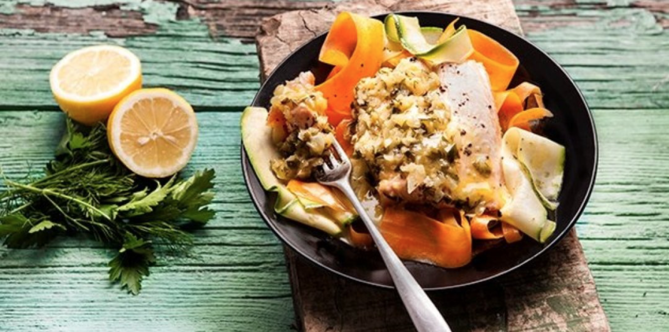 Σολομός σοτέ με ταλιατέλες λαχανικών