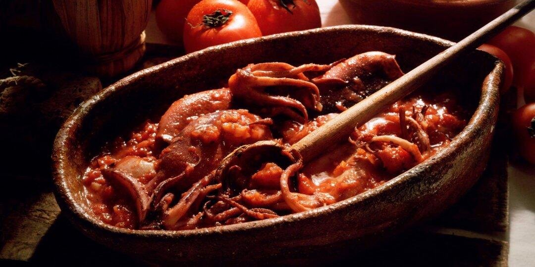 Κοκκινιστά καλαμάρια με μπαχάρι και δάφνη