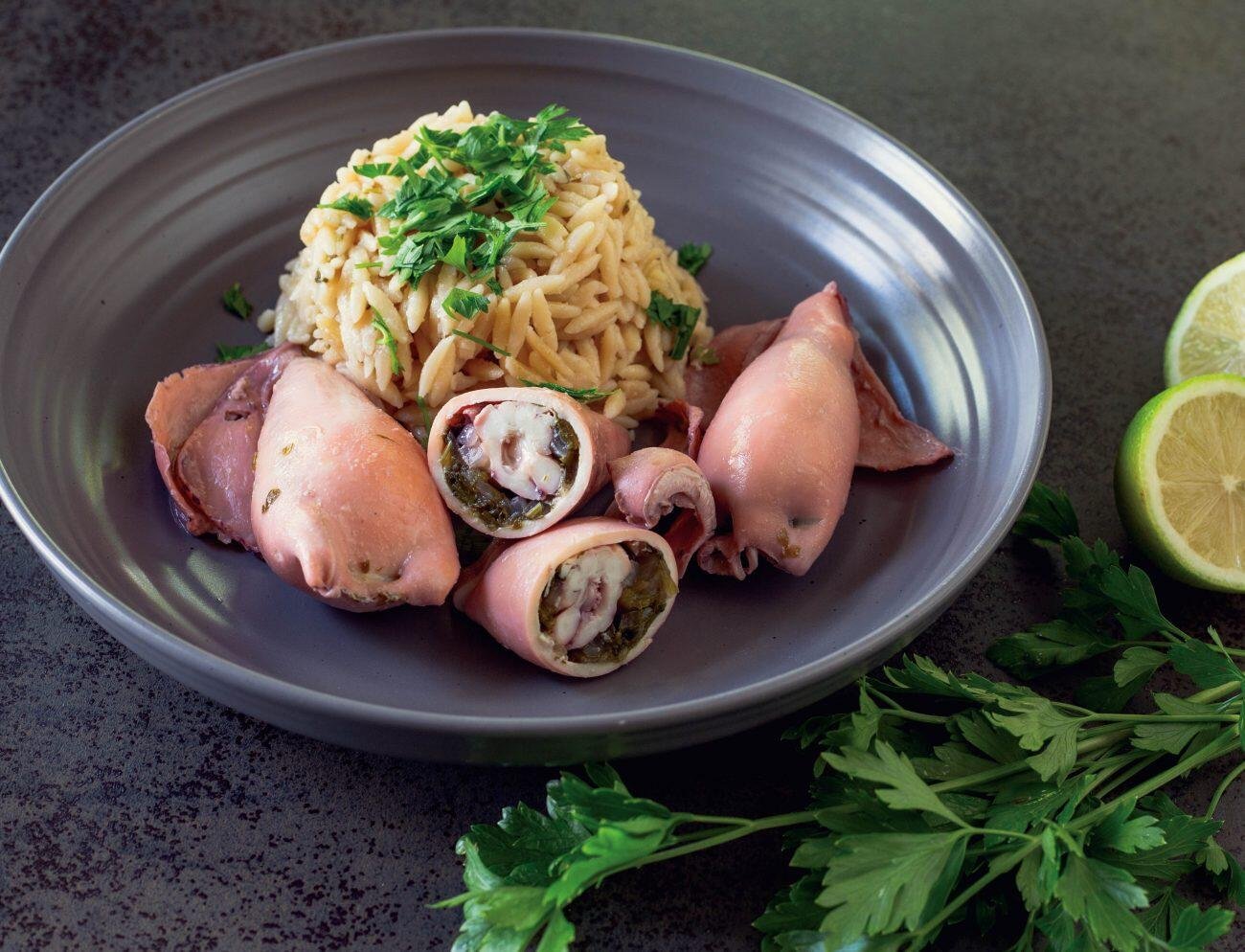 Καλαμαράκια λεμονάτα σερβιρισμένα με κριθαρότο