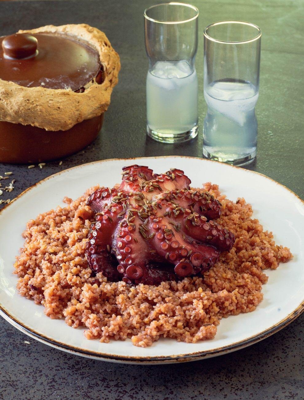 Χταπόδι με ούζο σερβιρισμένο με πουργούρι