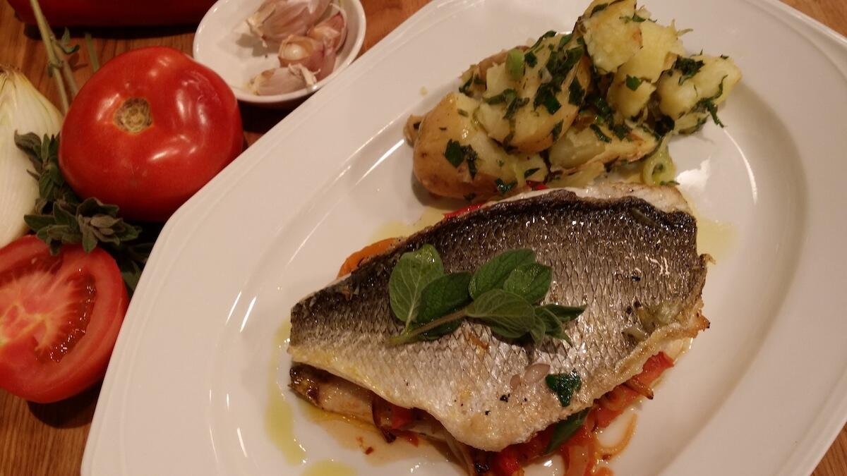 Σ’ ένα ταψί βάζουμε τα ντοματίνια, το κρεμμύδι και το σκόρδο. Ραντίζουμε με ελαιόλαδο και τα ψήνου...