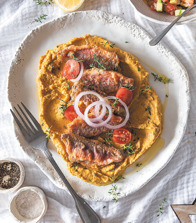 Φιλεταρισμένα μπαρμπούνια με φάβα και δροσερή σαλάτα