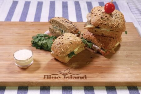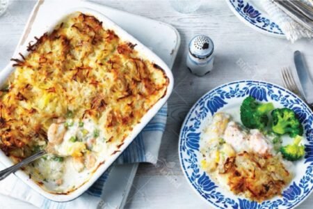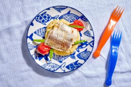 Κατσαρόλα Κυρίως-Πιάτο Μαριναρισμένα Μικροί Σεφ Τηγάνι Μαριναρισμένο Φιλέτο Λαβράκι με εσπεριδοειδή σερβιρισμένο με πουρέ από γλυκοπατάτα και καρότο, βραστά λαχανικά και κρεμώδες σάλτσα πορτοκαλιού