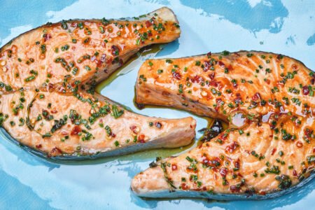 Σολομός steak με Σιρόπι Σφένδαμου και Τσίλι