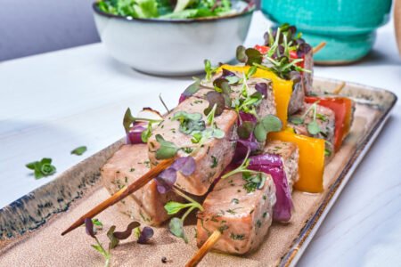 Τόνος σουβλάκι με γλυκιές πιπεριές και κόκκινο κρεμμύδι