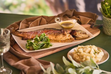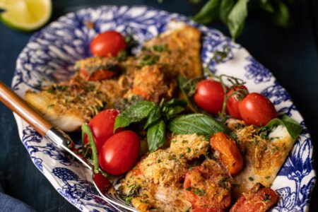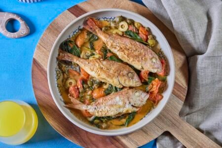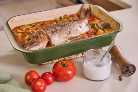 Κυρίως-Πιάτο Φούρνος Φαγκρί στο φούρνο με λαχανικά ψημένα με ντομάτα (με έμπνευση το παραδοσιακό ψάρι προτέττο)