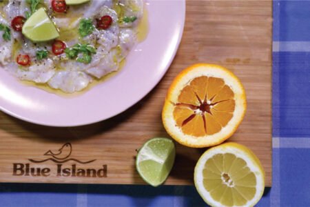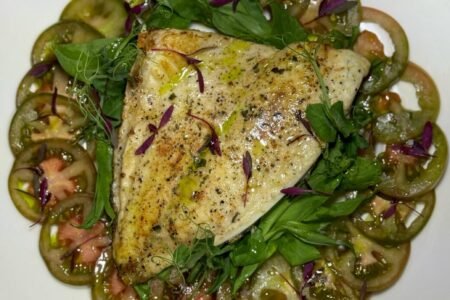 Κυρίως-Πιάτο Μαριναρισμένα Τηγάνι Φιλέτα Φιλέτο Τσιπούρας Μαριναρισμένο συνοδευμένο με μαύρα Ντοματίνια Καρπάτσιο, φύλλα Λουβάνας και Λαδολέμονο