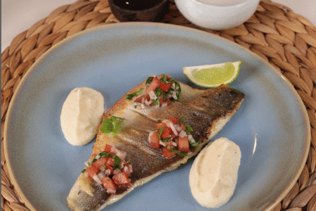 Κατσαρόλα Κυρίως-Πιάτο Μαριναρισμένα Τηγάνι Φιλέτα Μαριναρισμένο Λαβράκι με πουρέ σελινόριζας & pico de gallo