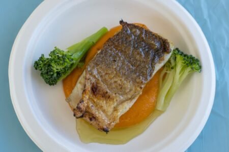 Κατσαρόλα Κυρίως-Πιάτο Μαριναρισμένα Μικροί Σεφ Τηγάνι Μαριναρισμένο Φιλέτο Λαβράκι με εσπεριδοειδή σερβιρισμένο με πουρέ από γλυκοπατάτα και καρότο, βραστά λαχανικά και κρεμώδες σάλτσα πορτοκαλιού