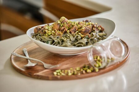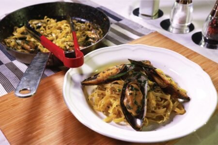 Σουπιές στην κατσαρόλα με chutney χρυσόμηλου & ταλιατέλες με μελανι & χαλεπιανά