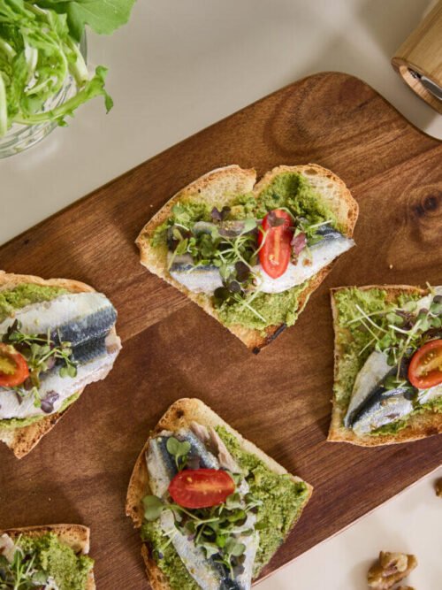 Μπρουσκέτες με μαριναρισμένες σαρδέλες και πέστο με καρύδια και ρόκα