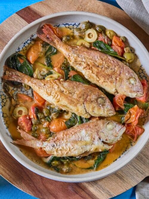 Φαγκρί στο φούρνο με λαχανικά ψημένα με ντομάτα (με έμπνευση το παραδοσιακό ψάρι προτέττο)
