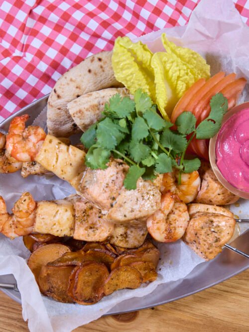 Τόνος σουβλάκι με γλυκιές πιπεριές και κόκκινο κρεμμύδι