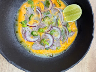 Ceviche λαβράκι με leche de tigre και πουρέ γλυκοπατάτας