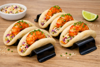 Βao buns με σαλάτα coleslaw και γαρίδες με σόγια και μέλι