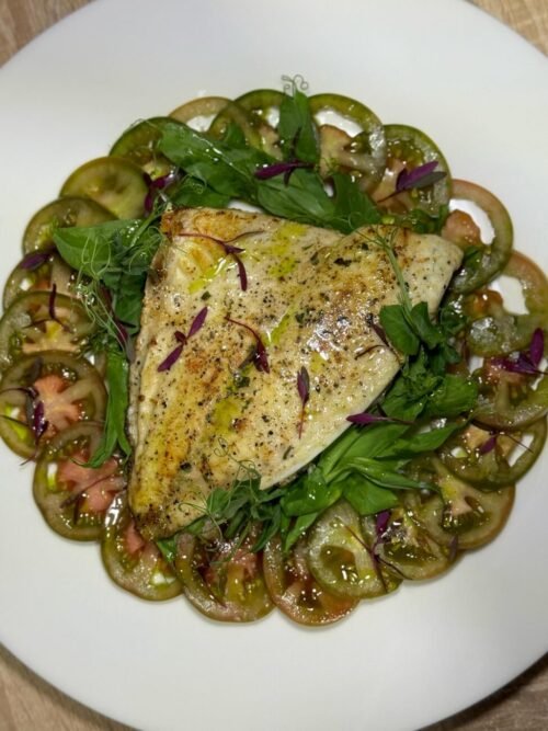 Φιλέτο Τσιπούρας Μαριναρισμένο συνοδευμένο με μαύρα Ντοματίνια Καρπάτσιο, φύλλα Λουβάνας και Λαδολέμονο