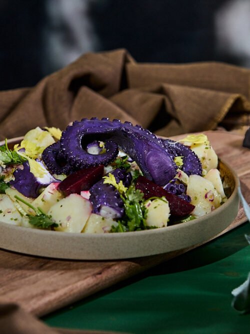 Χταπόδι Μαρινάτο σε κόκκινο Λάχανο με Πατατοσαλάτα