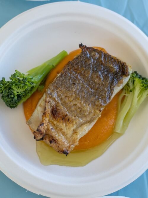 Μαριναρισμένο Φιλέτο Λαβράκι με εσπεριδοειδή σερβιρισμένο με πουρέ από γλυκοπατάτα και καρότο, βραστά λαχανικά και κρεμώδες σάλτσα πορτοκαλιού