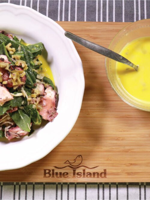 Προμηθευόμαστε χταπόδι καθαρισμένο από την ψαραγορά μας Blue Island. Πλένουμε και το στραγγίζουμε σε χ