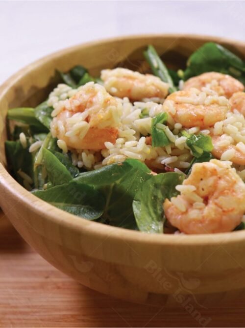 Προμηθευόμαστε τα θαλασσινά μας από τις Ψαραγορές Blue Island. Ψήνουμε τις γαρίδες μας σε αλατισμένο ζε