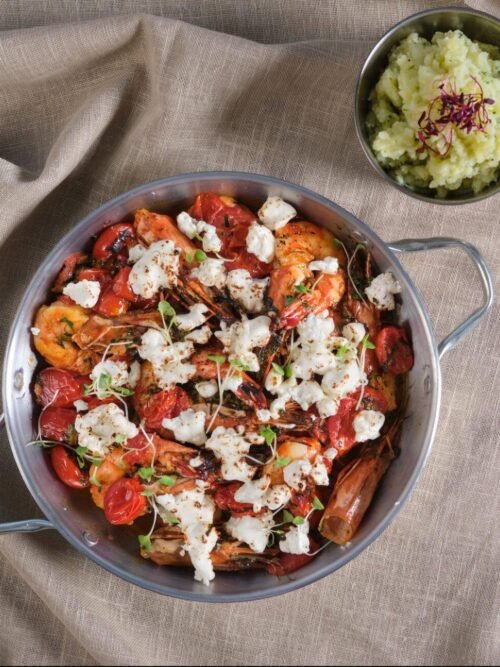 Γαρίδες Σαγανάκι με Limoncello και Κατσικίσιο Τυρί σερβιρισμένες με Σκορδαλιά