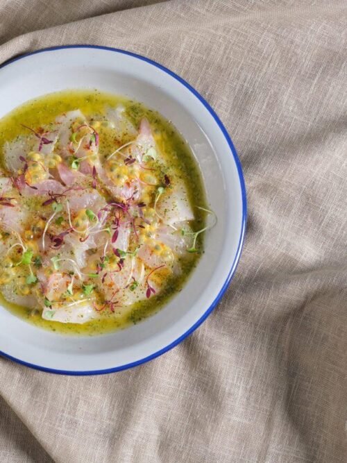 Τσιπούρα Carpaccio με dressing από Limoncello, φρέσκα Μυρωδικά και Passion Fruit