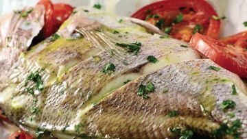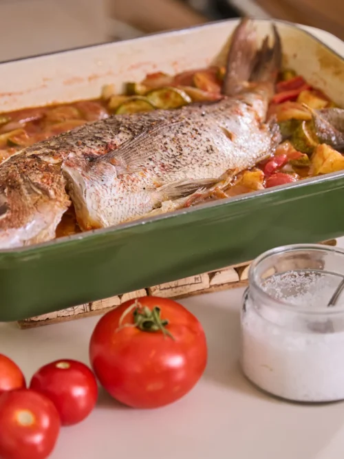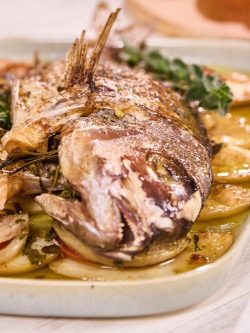 Φαγκρί στο φούρνο με λαχανικά ψημένα με ντομάτα (με έμπνευση το παραδοσιακό ψάρι προτέττο)