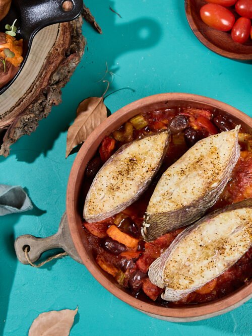Στέικ Φαγκρί στο φούρνο με Μεσογειακή σάλτσα σερβιρισμένο με γλυκοπατάτα τζάκετ