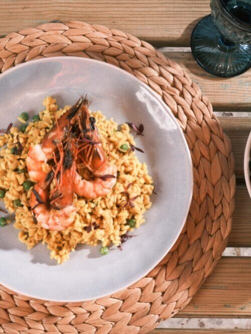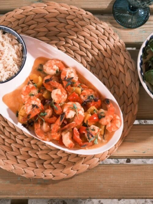 Γλυκές και πικάντικες γαρίδες με σάλτσα καρύδας σερβιρισμένες με ρύζι Mπασμάτι