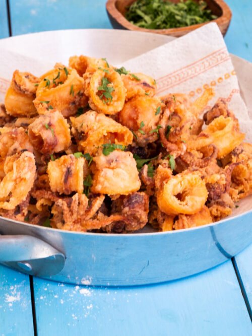Προμηθευόμαστε τα Kαλαμάρια από την ψαραγορά μας BlueIsland. Ζεσταίνουμε το λάδι σε ένα μεγάλο βαθύ τ