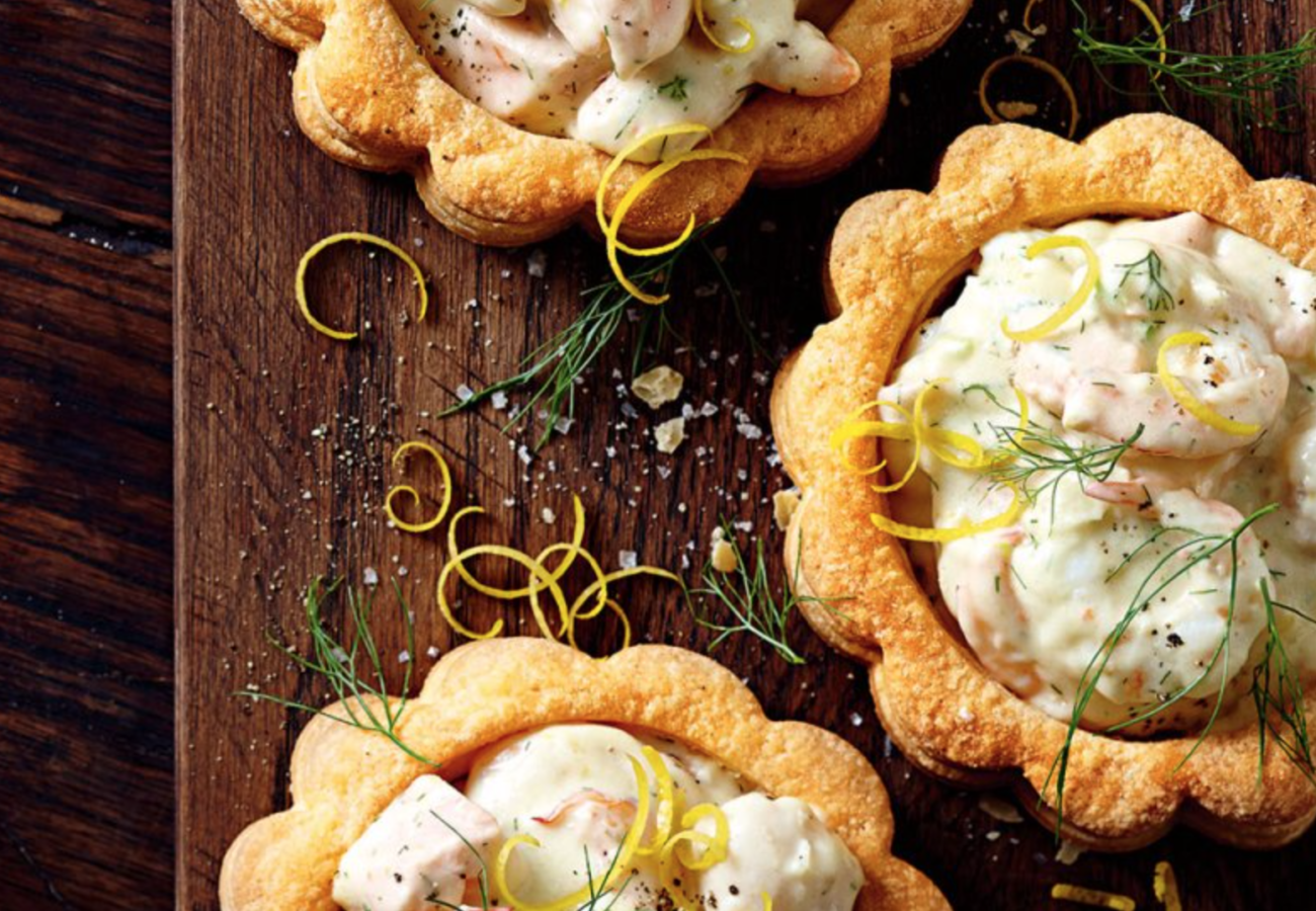 Ακολούθως, ανακατεύουμε απαλά με ένα κουτάλι και γεμίζουμε τα βολ-ο-βαν λίγο πριν τα σερβίρουμε με τη γέμιση των θαλασσινών.