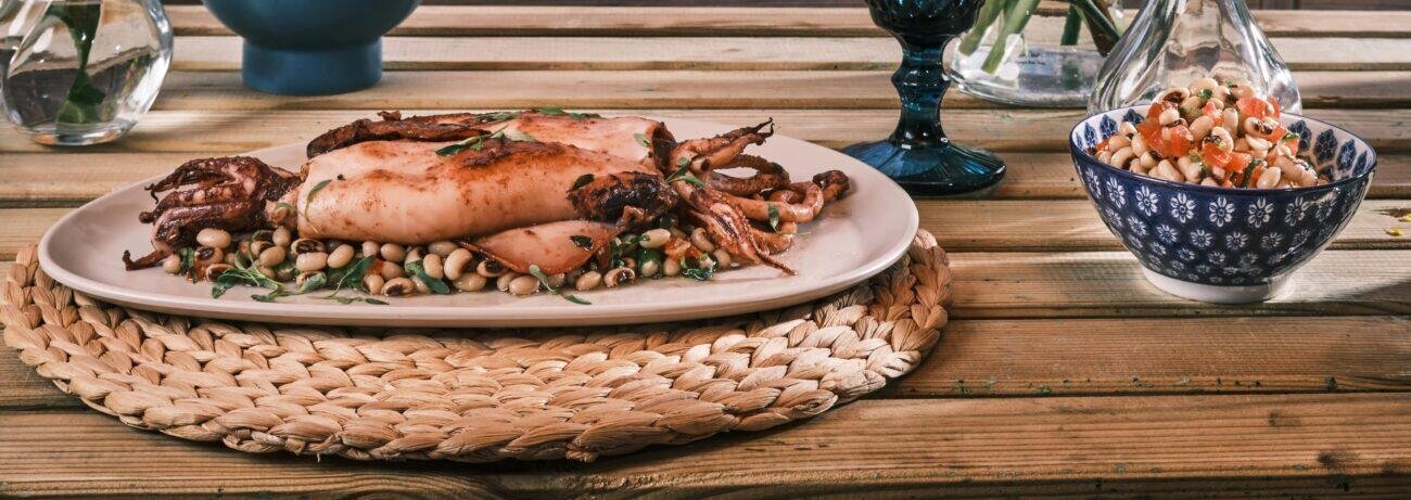 Καλαμάρια στο τηγάνι και Σαλάτα με Φασόλια Μαυρομάτικα