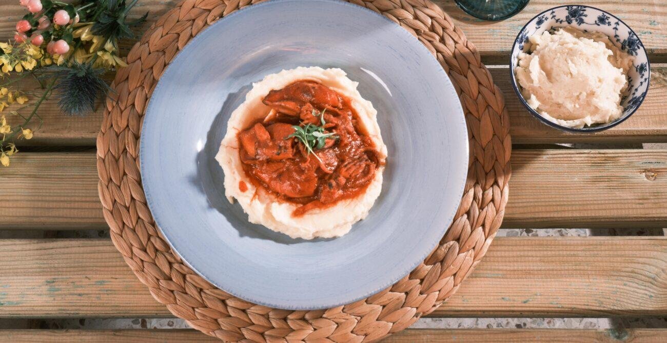 Καλαμαράκια κοκκινιστά με Πουρέ Πατάτας