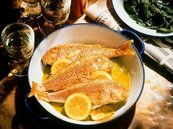 Ξεπλένουμε και στραγγίζουμε τα μπαρμπούνια. Τα αλατοπιπερώνουμε και τα τοποθετούμε σε μέτρια πλατιά κατσαρόλα και σε χαμηλή φωτιά.