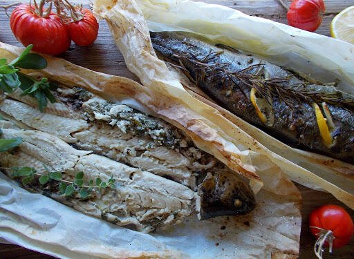 Πέστροφα στη Λαδόκολλα με Θυμάρι, Σκόρδο και Μανταρίνι
