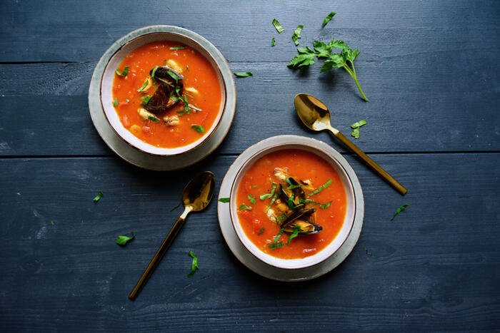 Αφαιρούμε το ψαχνό από τα περισσότερα μύδια και τα ρίχνουμε στη σούπα, κρατώντας μερικά ολόκληρα με το κέλυφος. Αλατοπιπερώνουμε ανάλογα και ρίχνουμε μέσα και τα ολόκληρα μύδια.