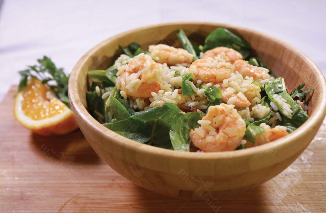 Σε ένα μεγάλο μπολ ανακατεύουμε το ρύζι με τις γαρίδες και ακολούθως προσθέτουμε αλάτι και πιπέρι.