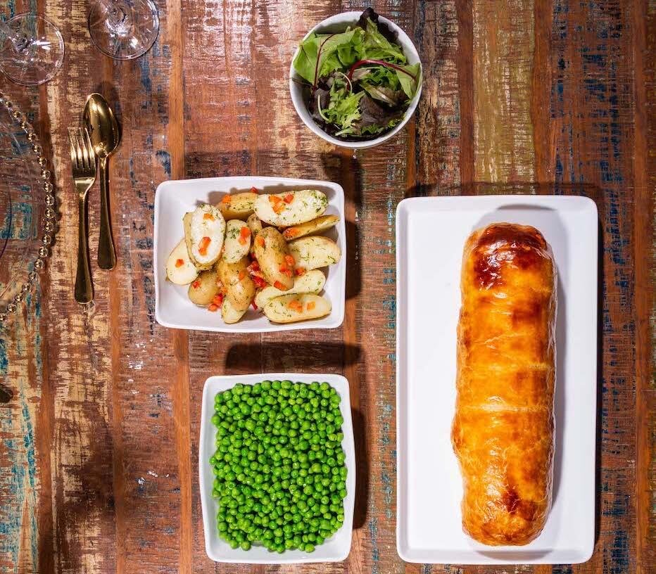 Στη συνέχεια ανοίγουμε το φύλλο σφολιάτας λίγο μεγαλύτερο από το φιλέτο σολομού, βάζουμε πάνω στη σφολιάτα το σολομό, το ρύζι, το σπανάκι, το αυγό, και τα μανιτάρια σε μια ευθεία γραμμή κατά μήκος της σφολιάτας. Κάνουμε ρολό τη σφολιάτα και με ένα πινέλο αλείβουμε με το αυγό. Ψήνουμε σε προ θερμασμένοφούρνο στους 180 βαθμούς κελσίου για 35 με 40 λεπτά και μέχρι να ροδοκοκκινίσει η σφολιάτα εξωτερικά.