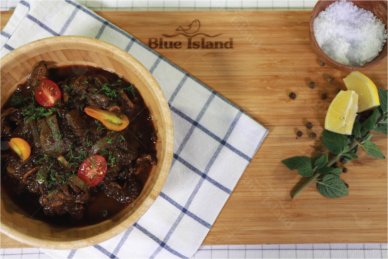 Προμηθευόμαστε τις σουπιές μας τεμαχισμένες σε μικρά κομμάτια από την ψαραγορά μας Blue Island.