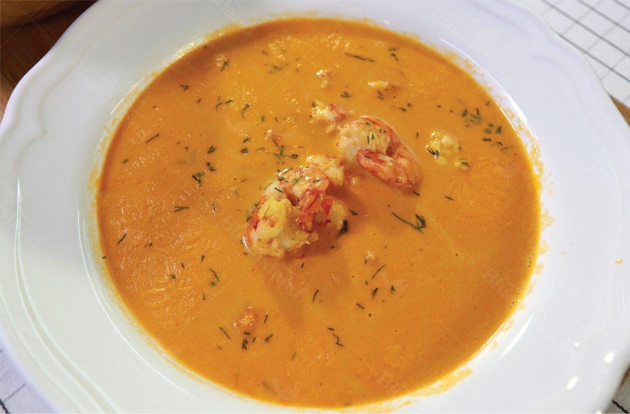 Προσθέτουμε νερό, να ξεπερνάει λίγο σε ύψος τα υλικά, και αφήνουμε να σιγοβράσουν, σκεπασμένα, για 45′. Δοκιμάζουμε το αλάτι. Ενώ είναι ζεστή, την περνάμε από σουρωτήρι σε καθαρή κατσαρόλα, πιέζοντας με κουτάλι, να περάσει όλο το υγρό και αρκετός πολτός. Προσθέτουμε την κρέμα γάλακτος και σιγοβράζουμε 5′-6′. Ρίχνουμε πιπέρι φρεσκοαλεσμένο και προσθέτουμε τις μισές γαρίδες, κομμένες σε 3-4 κομμάτια την καθεμία μαζί με τις 2 κ.σ. βούτυρο. Σιγοβράζουμε για 2′. Σερβίρουμε τη σούπα ζεστή, μοιράζοντας στα πιάτα τις υπόλοιπες γαρίδες ολόκληρες.