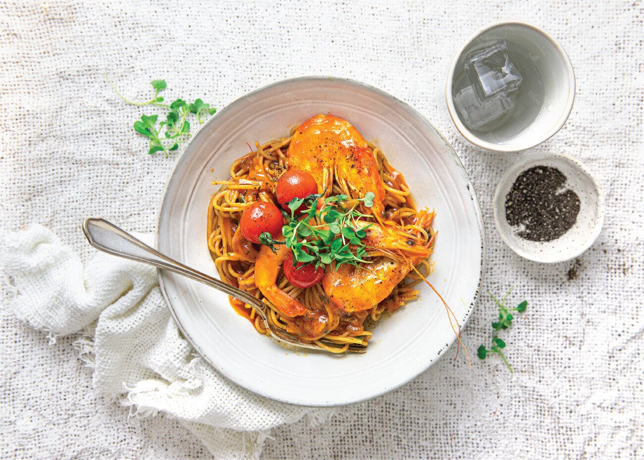 Σβήνουμε τη φωτιά και αφήνουμε λίγο να τραβήξουν στη σάλτσα. Γαρνίρουμε με ντοματίνια και microgreens.