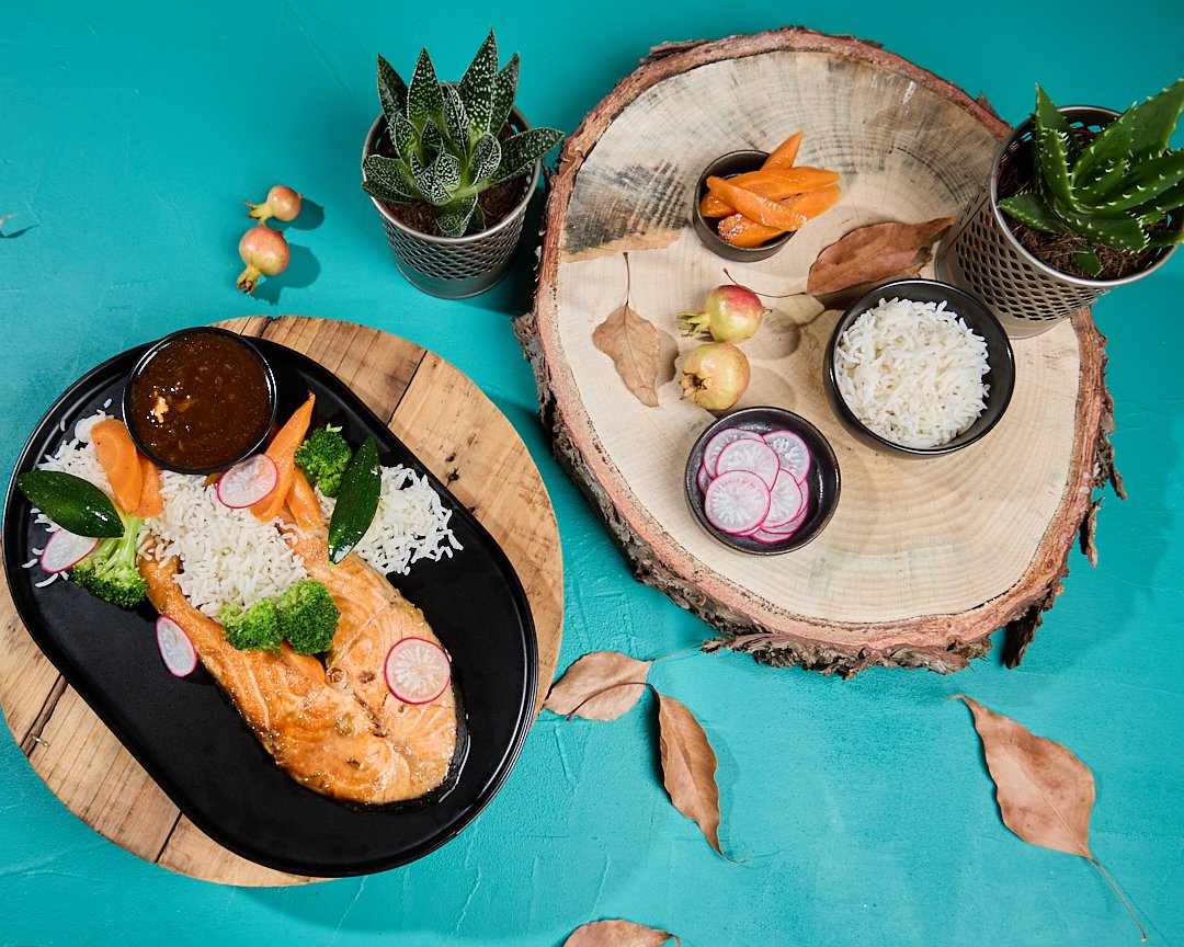 Στέικ Σολομού με σάλτσα Σόγιας σερβιρισμένα με μπασμάτι ρύζι και λαχανικά
