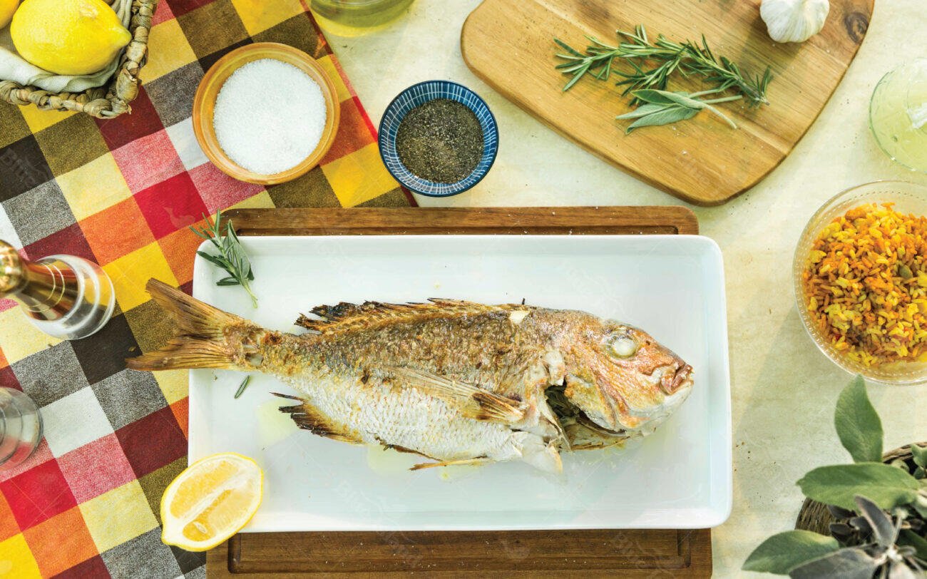 Πλένουμε το ψάρι. Βάζουμε τα αρωματικά στην κοιλιά και καλύπτουμε όλο το εξωτερικό με αλάτι.