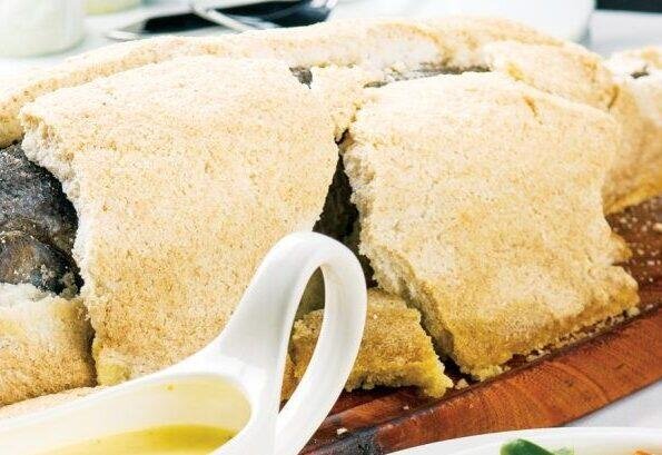 Όταν βγάλουμε το ψάρι από το φούρνο η κρούστα αλατιού θα έχει σκληρύνει πολύ. Τη σπάμε με ένα σφυρί ή με τη λαβή ενός μεγάλου μαχαιριού, την τραβάμε και την ανασηκώνουμε ξεκολλώντας ταυτόχρονα και την πέτσα με τα λέπια. Έτσι έχουμε καθαρό το πάνω φιλέτο του ψαριού, το οποίο το αφαιρούμε με ένα μαχαίρι και το βγάζουμε σε πιατέλα. Στη συνέχεια τραβάμε το κεντρικό κόκαλο και έτσι, πολύ εύκολα, ξεχωρίζουμε και το κάτω φιλέτο από την πέτσα.