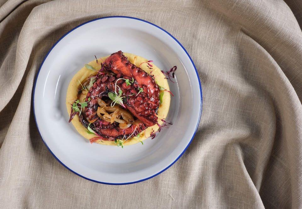 Χταπόδι με Φάβα και καραμελωμένα Κρεμμύδια