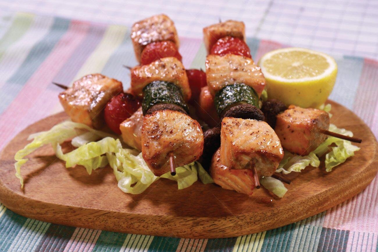 Όταν ετοιμάσουμε όλα τα υλικά μας, τα περνάμε πάνω στα ξυλάκια. Βάζουμε σε ταψί, ραντίζουμε με ελαιόλαδο και προσθέτουμε αλάτι και πιπέρι. Στη συνέχεια, ψήνουμε στο φούρνο για 10 με 15 λεπτά. Τέλος, γυρίζουμε και αφήνουμε στον φούρνο μέχρι να ψηθούν και από την άλλη πλευρά.