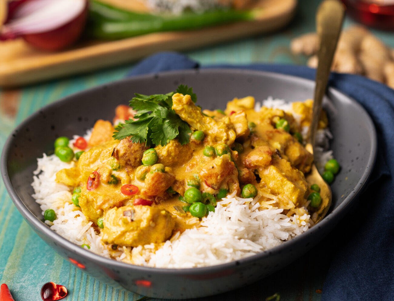 Σερβίρουμε το κάρυ με το ρύζι και πασπαλίζουμε με φύλλα κόλιανδρου.