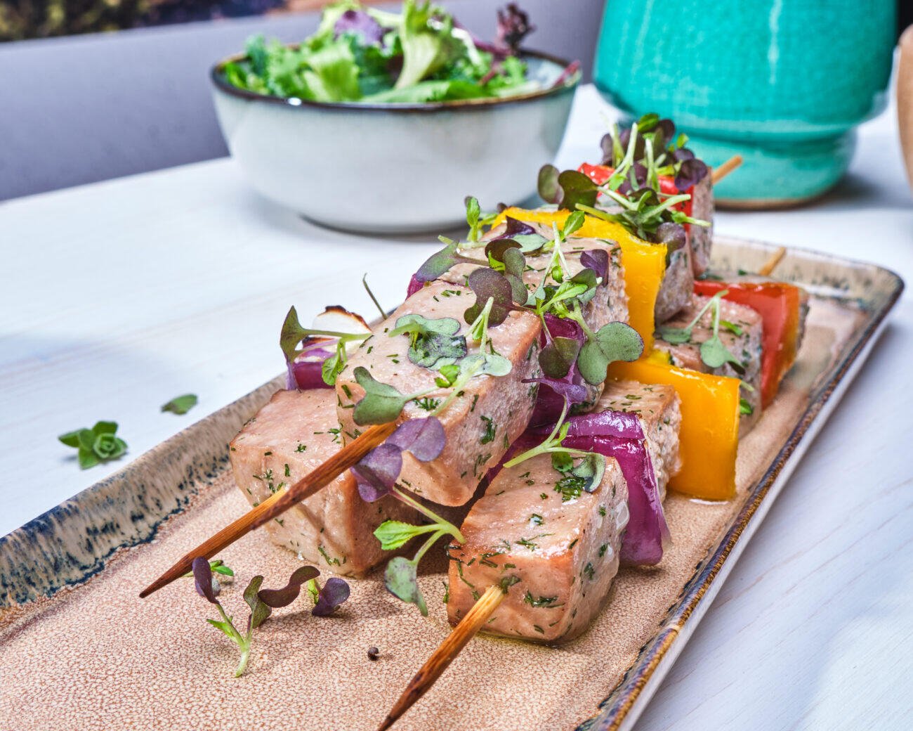 Τόνος σουβλάκι με γλυκιές πιπεριές και κόκκινο κρεμμύδι