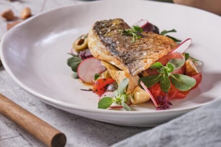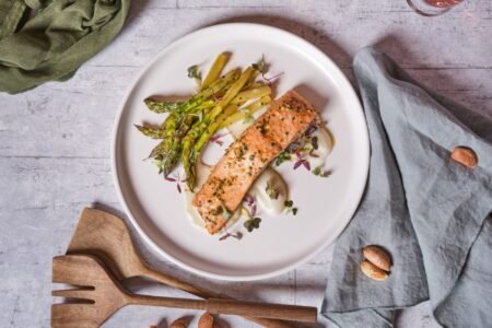 Christmas Fasting Oven Pot Garlic Salmon Fillets grilled with Green Asparagus and Cauliflower Purée, flavoured with Cardamom and Lime