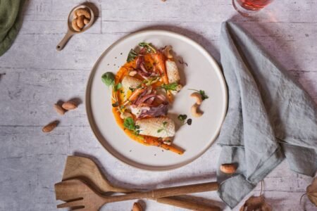 Christmas Fasting Pan Pot Sautéed Squid with Carrot Purée flavoured with Star Anise, Orange and Cashews